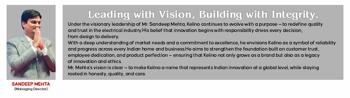 Founded in 2010 in Vasai, MumbaiVasai, Mumbai (Maharashtra), Kelino began its journey with a vision to transform the electrical accessories market through innovation, quality, and trust. At that time, the market was growing but filled with loopholes and inconsistent standards. Observing this, our Managing Director, Mr. Sandeep Ji Mehta, decided to take a bold step to innovate and create something of our own. His vision and determination became the foundation of Kelino.